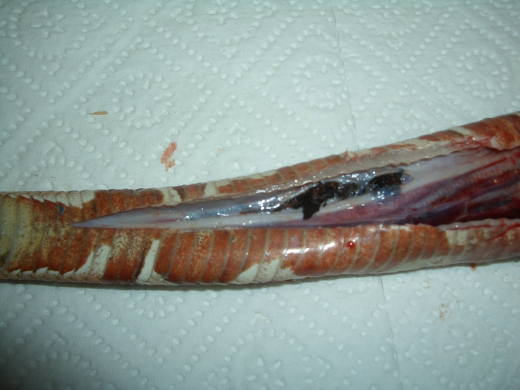 Todesfall bei den Kupferköpfen: Bilder hierzu findet Ihr hier und hier - aus ästhetischen Gründen ohne Thumbnail nur für die, die es wirklich interessiert. Ich kann mir zwar nicht 100%ig sicher sein, dass dies die Todesursache war, jedoch habe ich daraus gelernt und werde meine Tiere in Zukunft häufiger in Extra-Boxen füttern, auch wenn dies ein wenig mehr Streß für die Tiere bedeutet. |